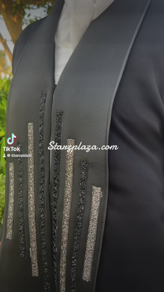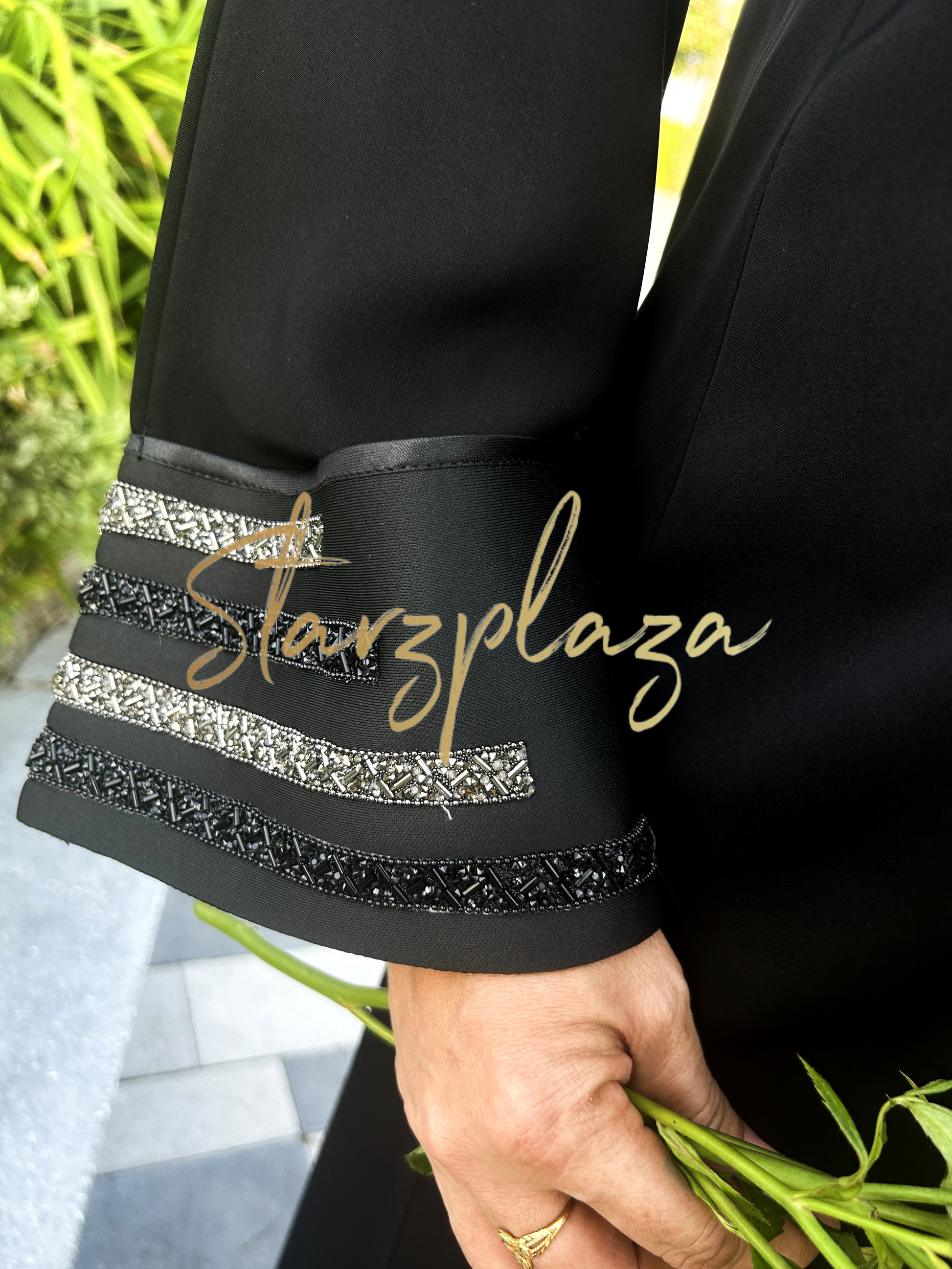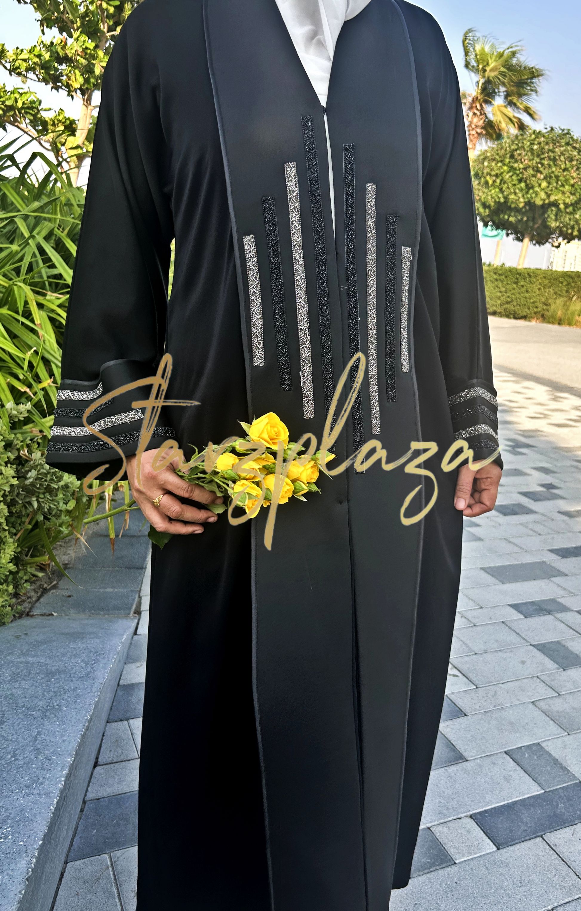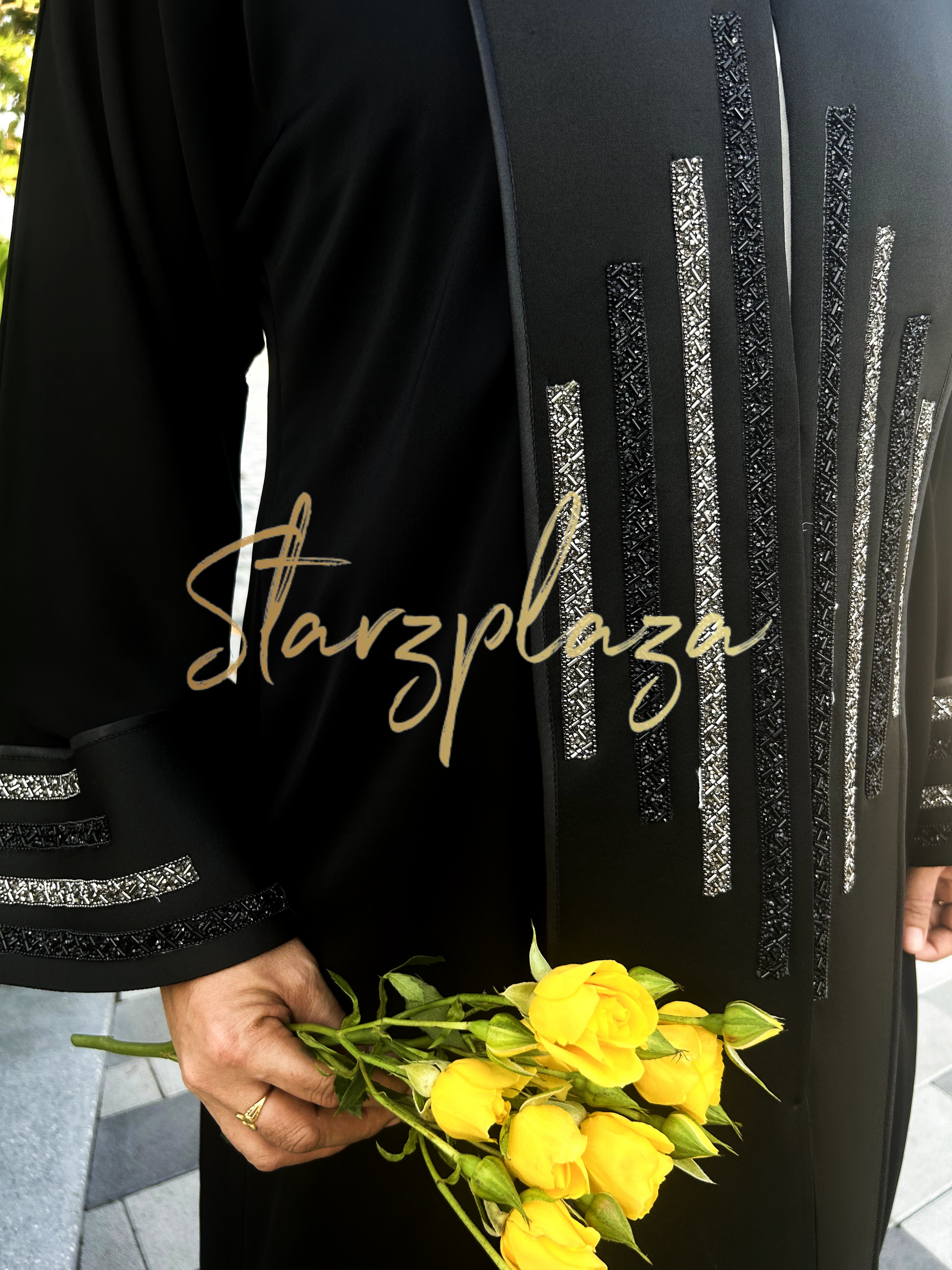 This Abaya features stunning black and white Swarovski-like crystals, adding luxurious sparkle to the elegant black fabric.