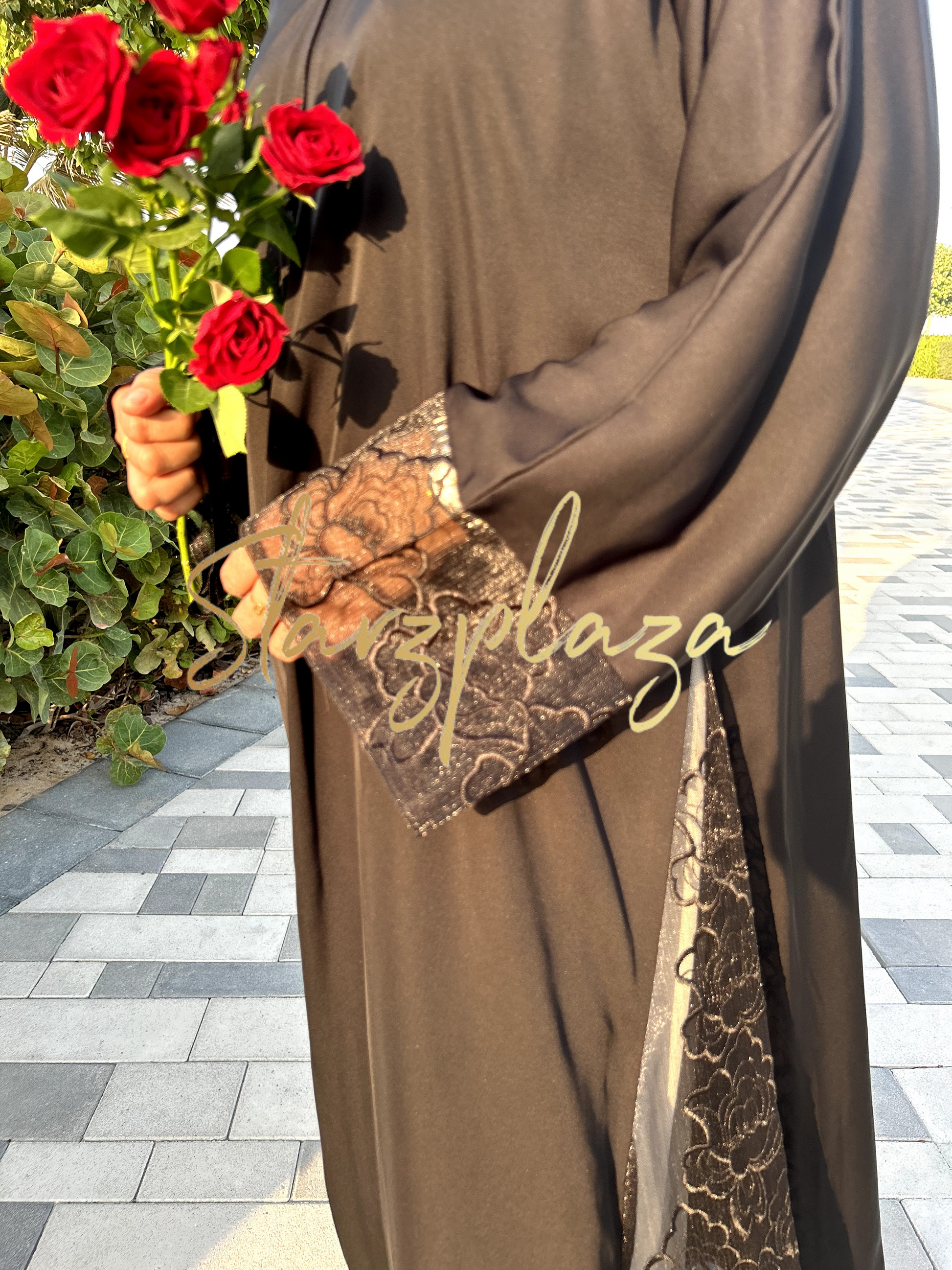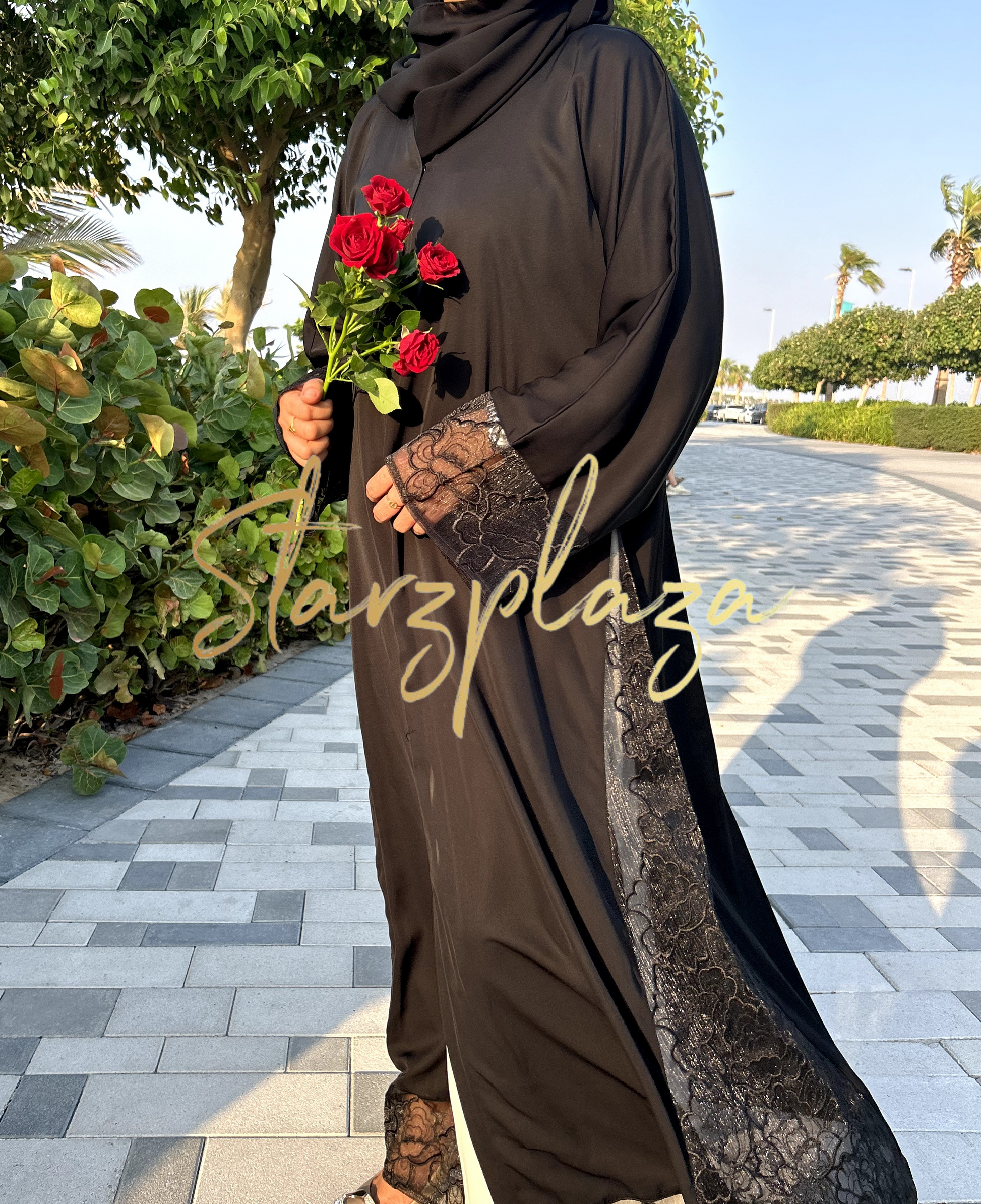 This abaya crafted from premium Nida material, features delicate mesh lace detailing on the sleeves and sides.