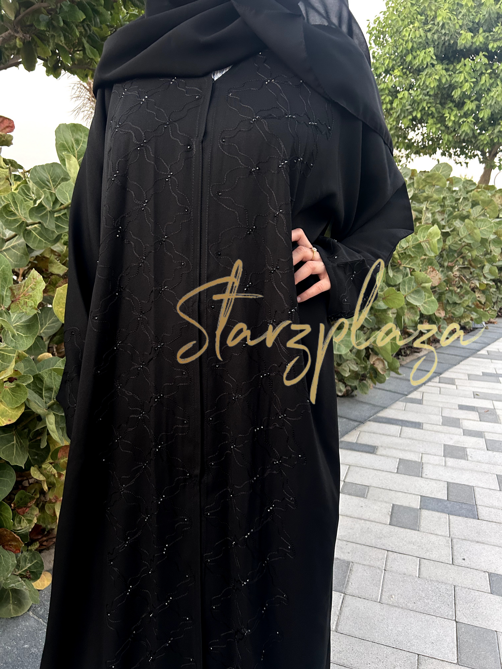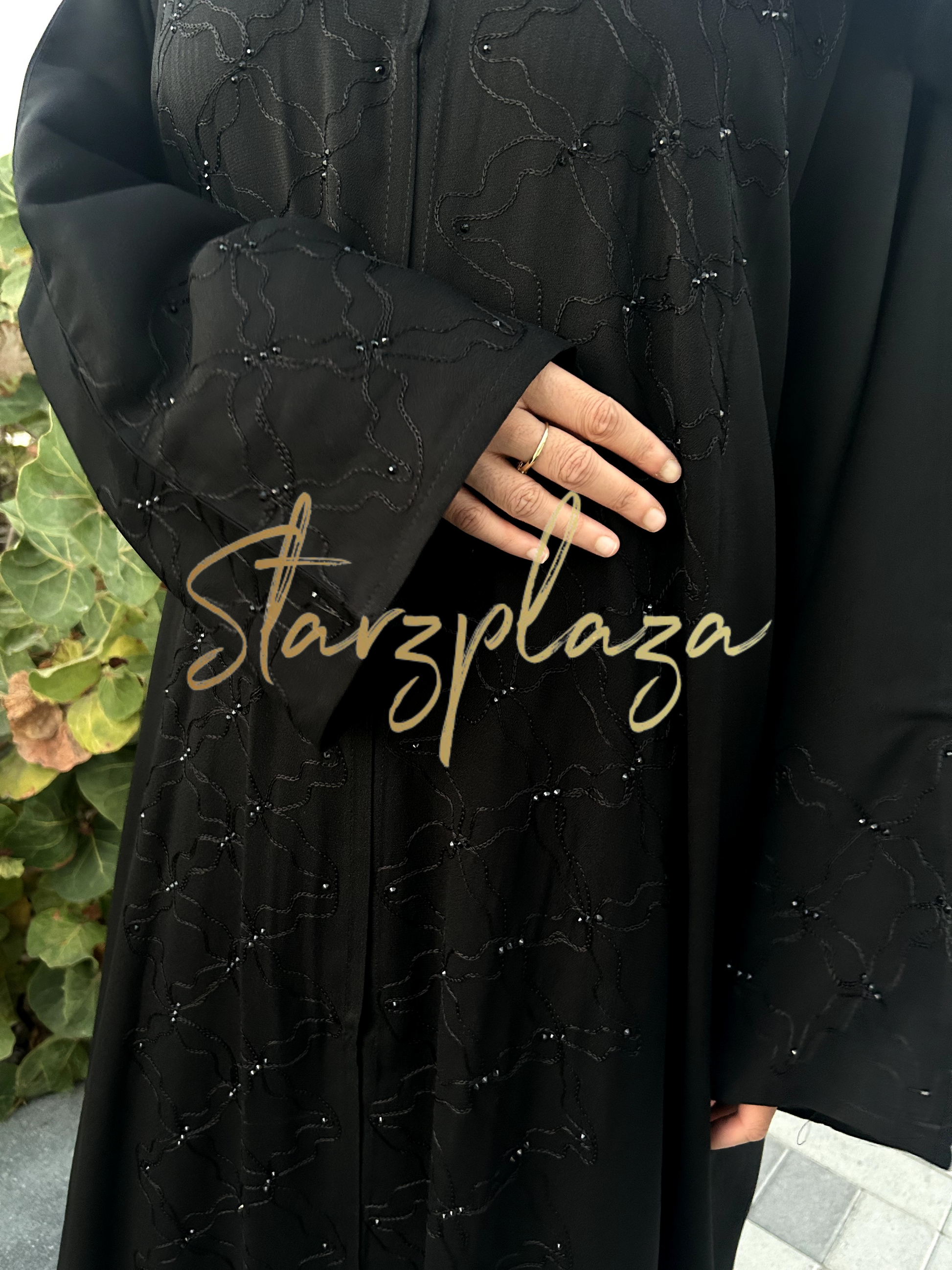 Made from soft crepe material, it features an intricate thread mesh design adorned with black stonework throughout. Perfect for those who love understated elegance with a touch of glamour. 🖤💎